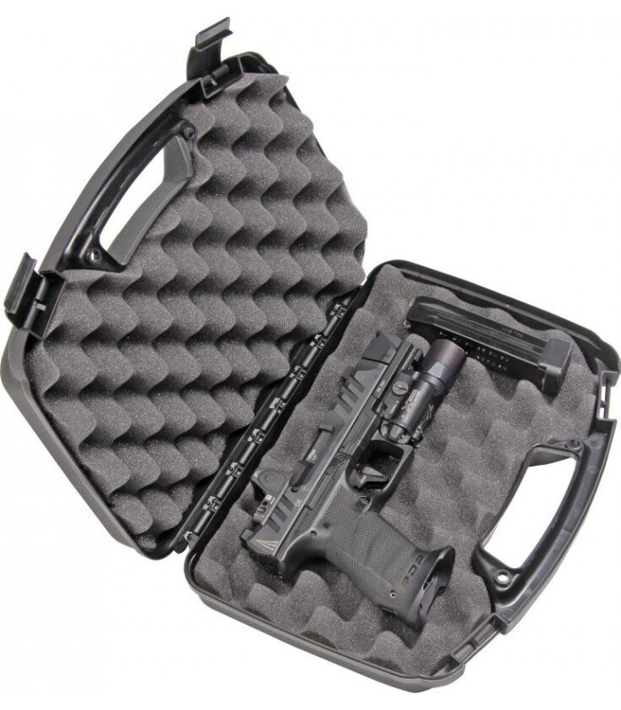 Futerał oferuje trwałą konstrukcję, stylowy wygląd, niezawodne zatrzaski i dużą wygodną rączkę. Wykonany z wytrzymałego polipropylenu z wykończeniem odpornym na zarysowania. Gruba wyściółka z pianki i podwójne zakładki na kłódki zapewniają najwyższy poziom bezpieczeństwa. Wystarczająco gruby, aby zmieścić blokadę spustu podczas podróży. Kłódki nie są dołączone.