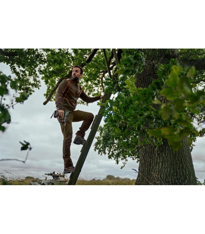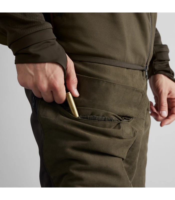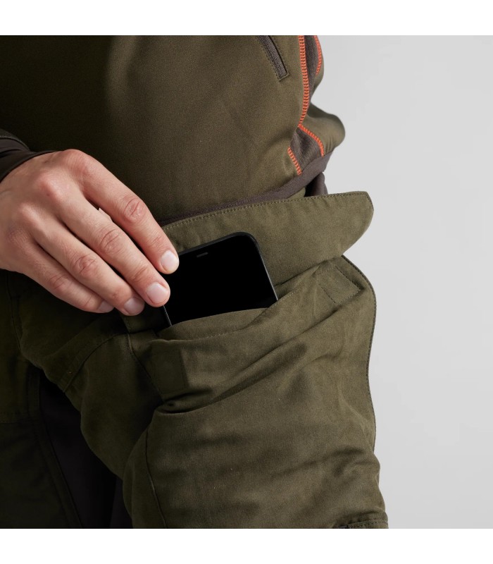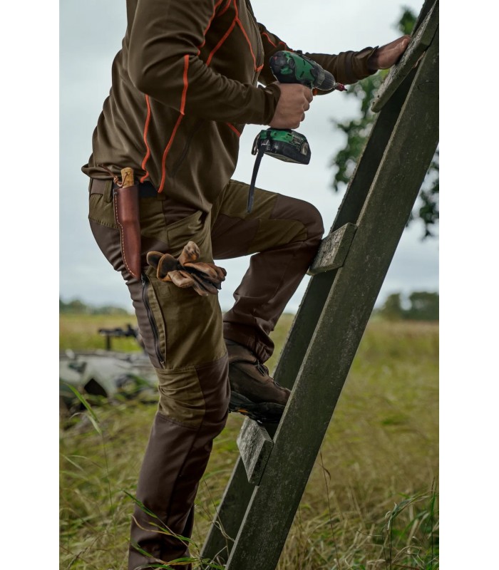 Spodnie Härkila Scandinavian są wykonane z bardzo cichej, miękkiej, wytrzymałej i szybkoschnącej mieszanki bawełny i poliestru. Mają również aktywny krój, z elastycznym pasem i elastycznymi panelami na pośladkach, kolanach i udach. Są niezwykle wygodne zarówno podczas chodzenia, jak i polowania. Posiadają również szereg funkcji, które szybko okażą się bezcenne: długie, wentylacyjne zamki z siateczką z tyłu ud, które umożliwiają cyrkulację powietrza w upały, jednocześnie chroniąc przed owadami i roślinnością. Z przodu ud znajdują się duże kieszenie zapinane na zamek, z ochronnymi klapkami z cichymi, magnetycznymi zapięciami. Prawa kieszeń zawiera przegródkę na cztery dodatkowe naboje karabinowe, a w lewej kieszeni znajduje się mała kieszonka na telefon komórkowy w podróży.